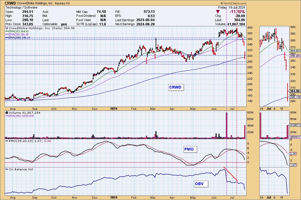 On the chart we can see that CRWD broke to new, all-time highs in June. Then on June 21 it traded down on extremely high volume, setting up the top of an OBV negative divergence. CRWD went on to make another all-time high on July 9, and the same day a lower OBV top set the negative divergence. Also on that day, the PMO crossed down through the signal line (crossover SELL Signal). We see that things started to really deteriorate on Wednesday, and on Friday the genie popped out of the bottle.