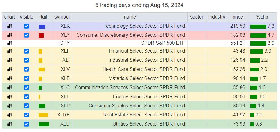 The big difference is that on this weekly RRG, Technology (and Utes) is the only sector on the right-hand, positive side of the RRG, while all others are on the left-hand, negative side of the chart.