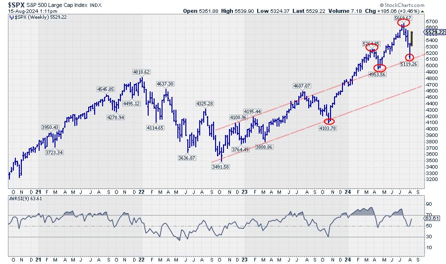 The recent rally out of the August 5th low is definitely stronger than I had anticipated. I was watching the resistance zone between 5350 and 5400, but that area was passed as if there was no supply whatsoever, at least at the index level.