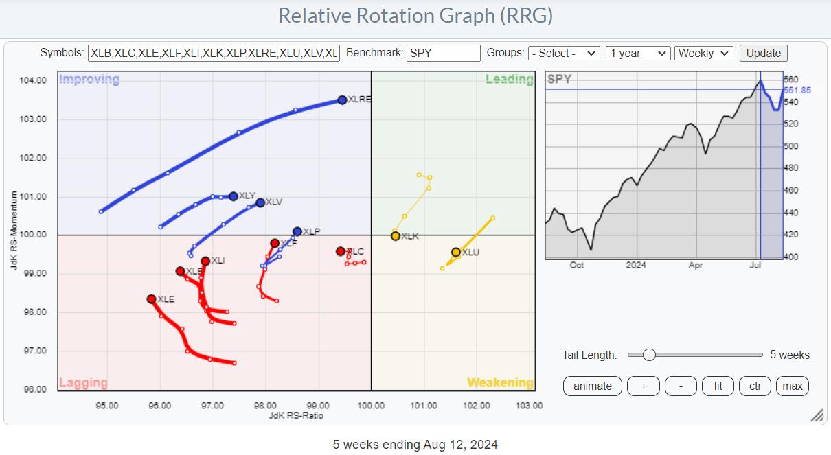 Bringing up the weekly RRG shows a different picture, which is more the opposite of the daily. Technology is the only sector still on a negative RRG-Heading. All others are on a positive RRG-Heading, or at least picking up relative momentum.