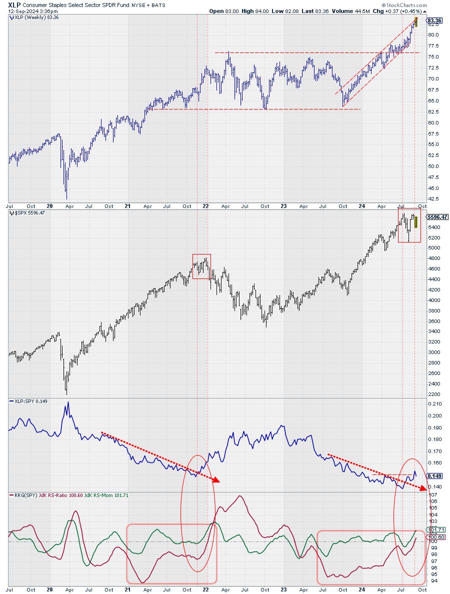 At the end of 2021, the consumer staples sector ended a prolonged period of underperformance (20 months), marked by the first vertical dashed line in November 2021, when the RS-Line broke above a falling resistance line. By then, the JdK RS-Momentum line had already crossed above the 100 level, pushing the XLP tail into the improving quadrant.