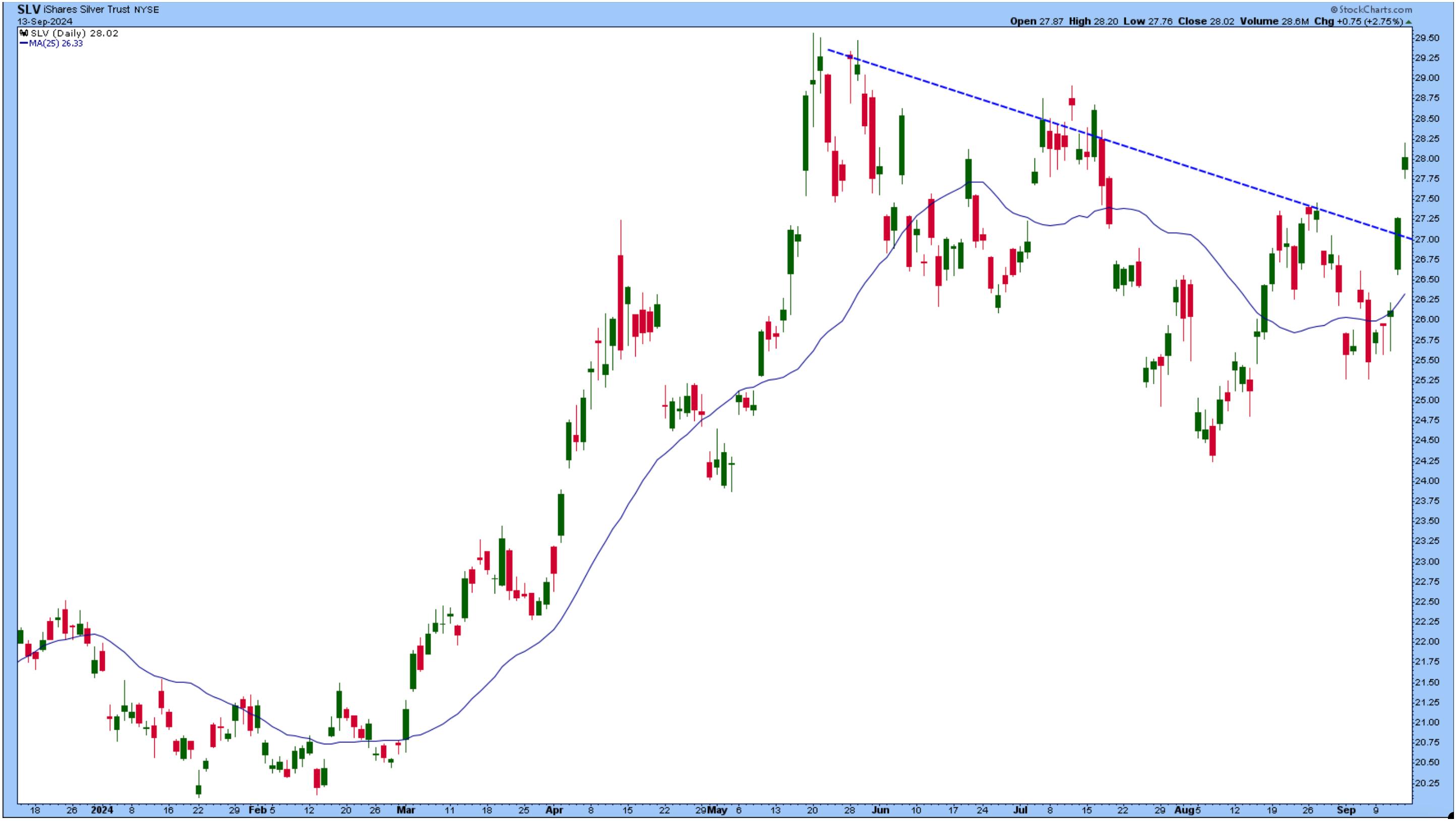 FIGURE 4. SILVER SURGES. SLV breaks above its downward-sloping trendline. Whether this upward move will continue rests on how much the Fed cuts rates in next week’s FOMC meeting.Chart source: StockCharts.com. For educational purposes.