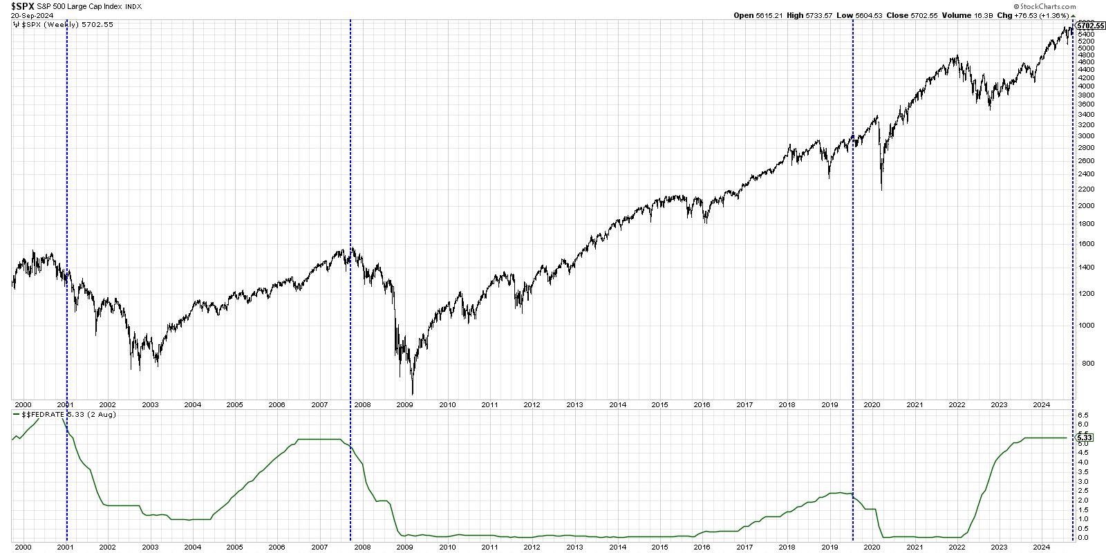 The chart above shows the S&P 500 index along with the Effective Fed Funds Rate. I’ve added blue vertical lines to identify when the Fed made their first rate cut in each cycle. So why are seasoned investment professionals a little hesitant to break out the champagne after the first rate cut this week? Because they remember years like 2001 and 2007, when the stock market pushed lower for months and months after that first decision.