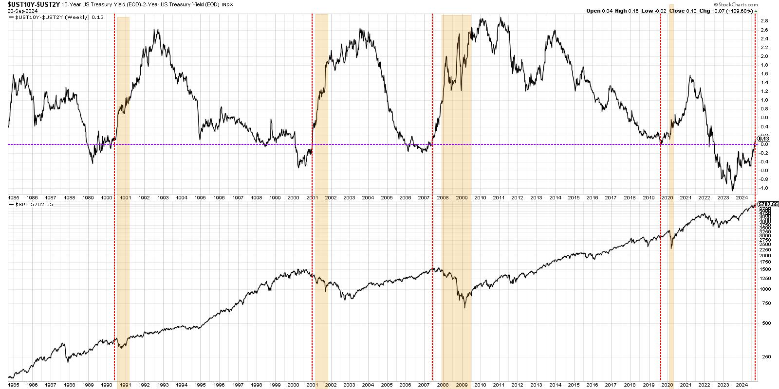 The top panel shows the different between the 10-year yield and the 2-year yield. I’ve added a purple horizontal line right at the zero level, because when the ratio dips below this point, we have what’s known as an inverted yield curve. I’ve also added red vertical lines to show when the yield curve had been inverted, but had switched to a more normalized shape. The orange-shaded areas denote recessionary periods, and the bottom panel shows the S&P 500 for reference.