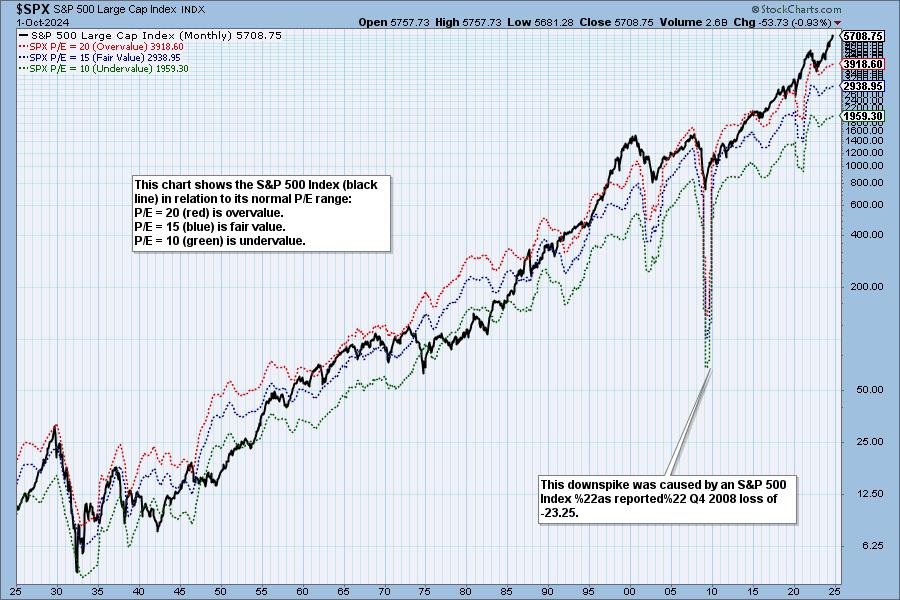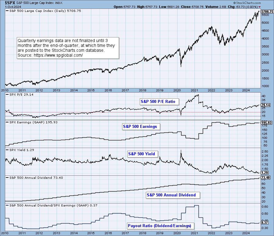 This DecisionPoint chart keeps track of S&P 500 fundamentals, P/E and yield, and it is updated daily — not that you need to watch it that closely, but it is up-to-date when you need it.