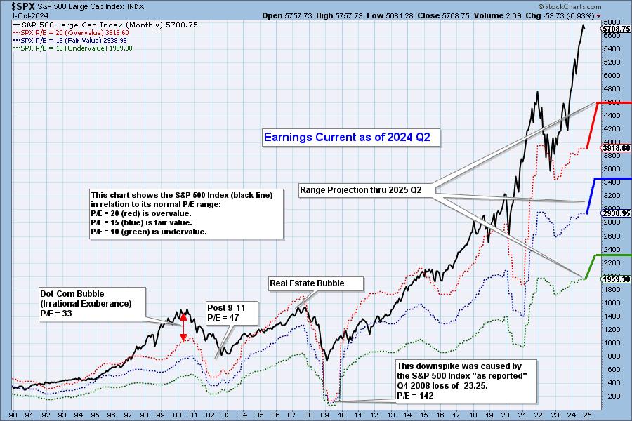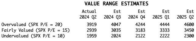 The following chart shows the normal value range of the S&P 500 Index, indicating where the S&P 500 would have to be in order to have an overvalued P/E of 20 (red line), a fairly valued P/E of 15 (blue line), or an undervalued P/E of 10 (green line). Annotations on the right side of the chart show where the range is projected to be based upon earnings estimates through 2025 Q2.