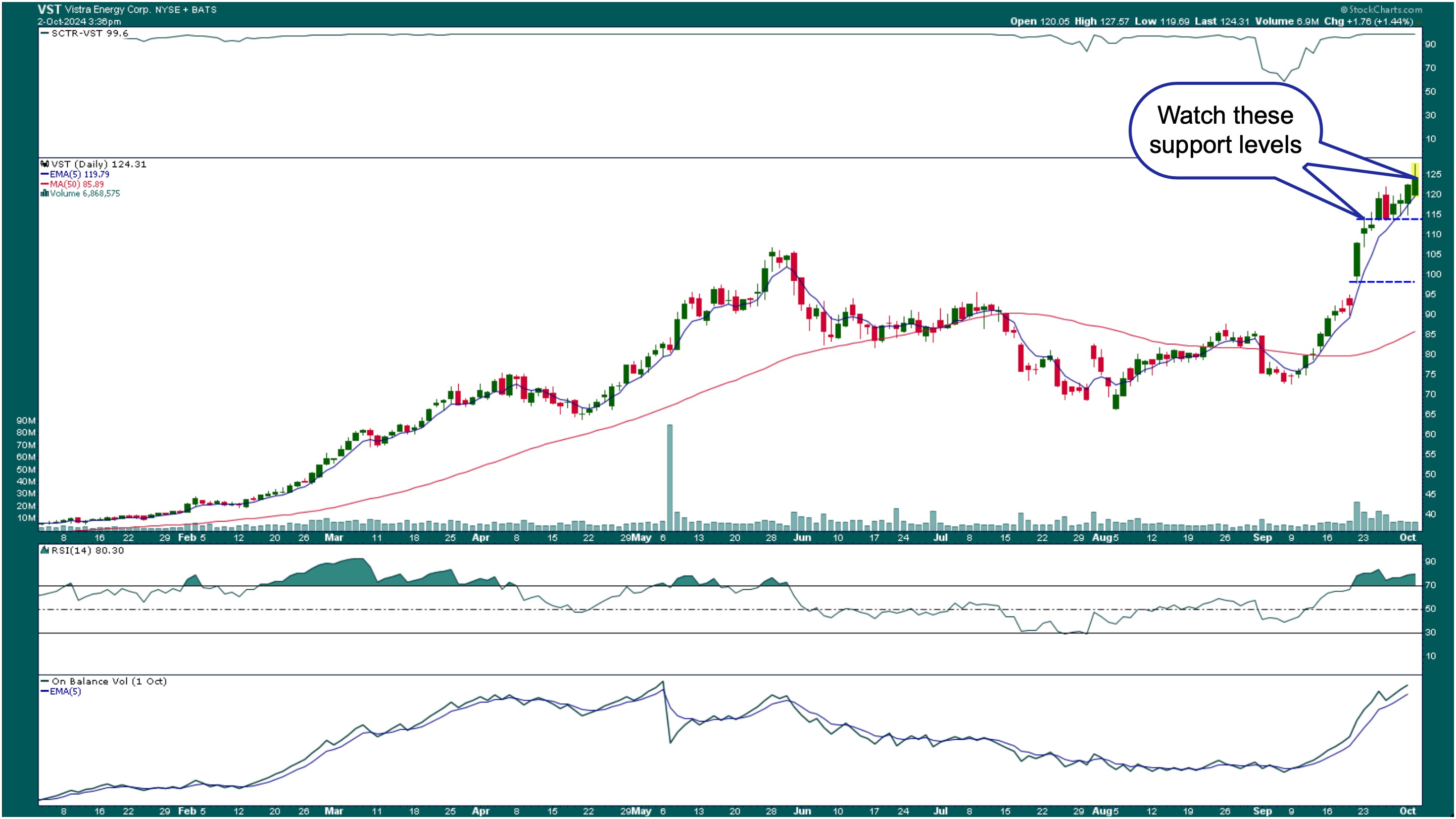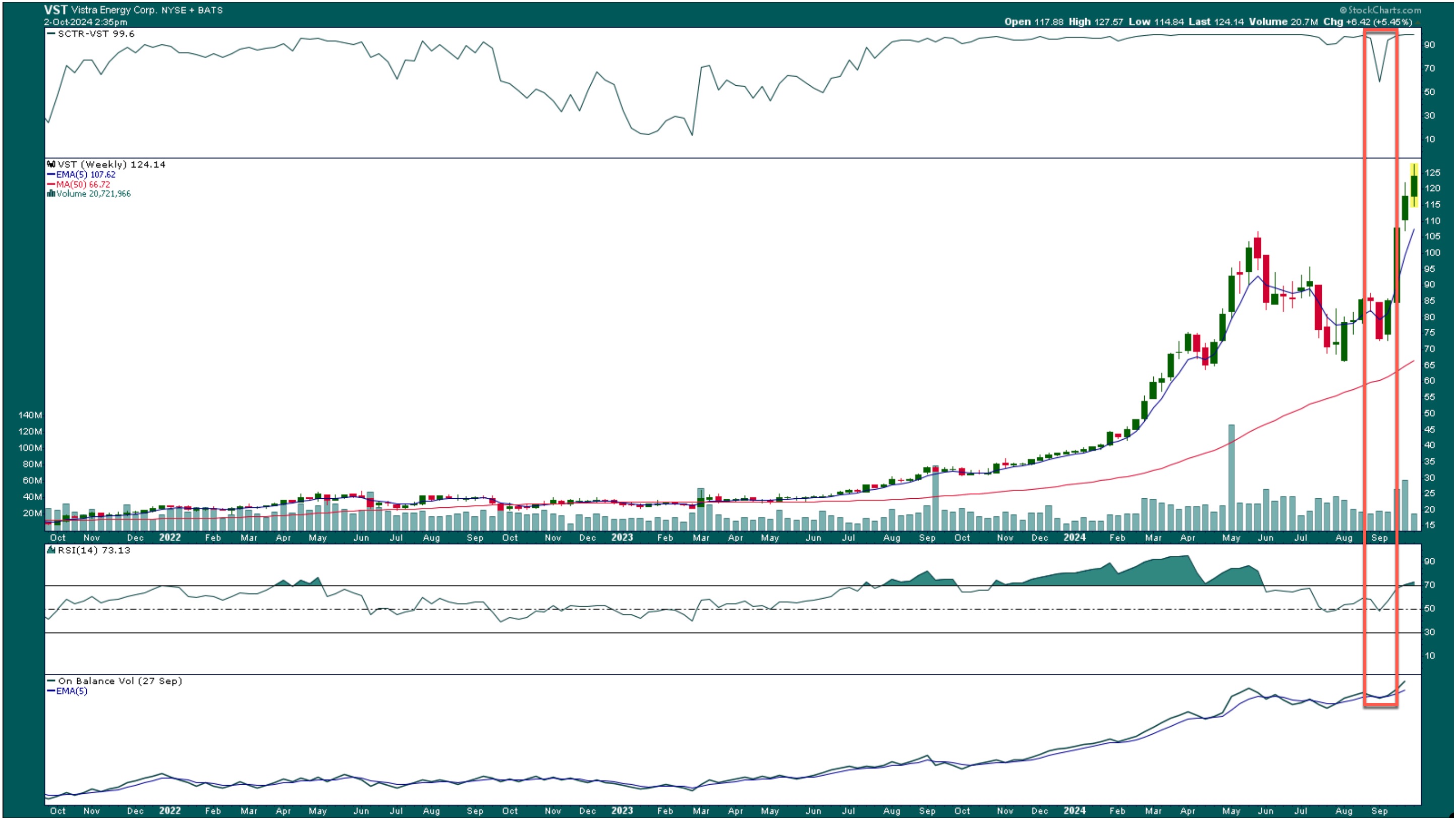 Looking at VST’s three-year weekly chart, your first thought may be that it’s too late to take advantage of the rally. But look at what the stock price did at the end of July after it pulled back to its 30-week exponential moving average (EMA).