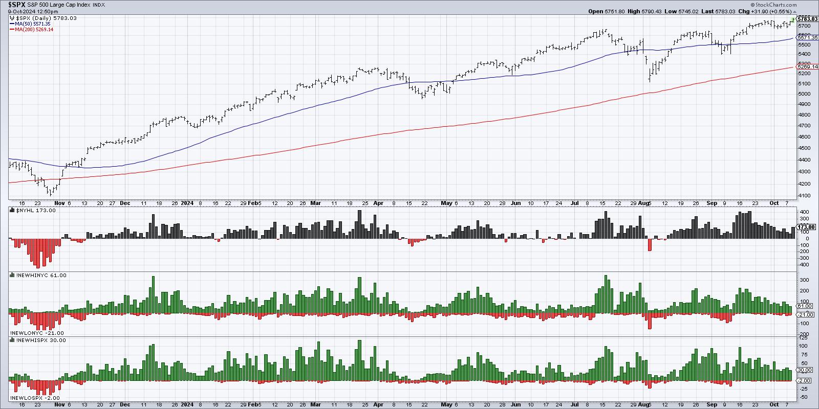 Here we can see the S&P 500 for the last 12 months along with the new 52-week highs minus new 52-week lows, the new highs and lows for the entire NYSE, and the new highs and lows for the S&P 500 members.