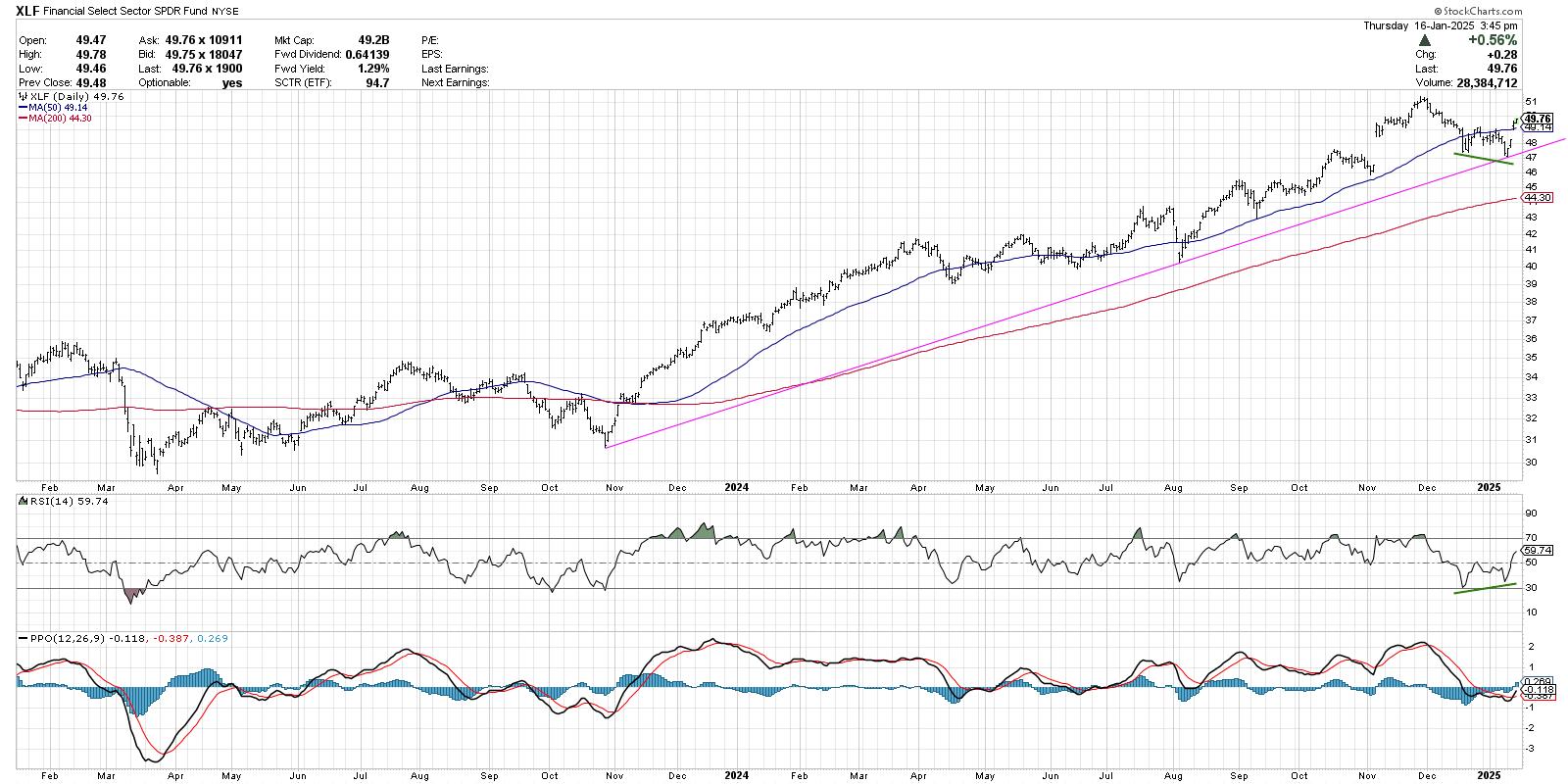 We can see that a similar trendline for the Financial Select Sector SPDR Fund (XLF) was tested last week and held before this week’s bounce higher. We can also observe a bullish momentum divergence over the last two months, with lower lows in price matched with higher lows in the RSI. Finally, the daily PPO indicator recently generated a bullish crossover, indicating the trend has now reversed higher.