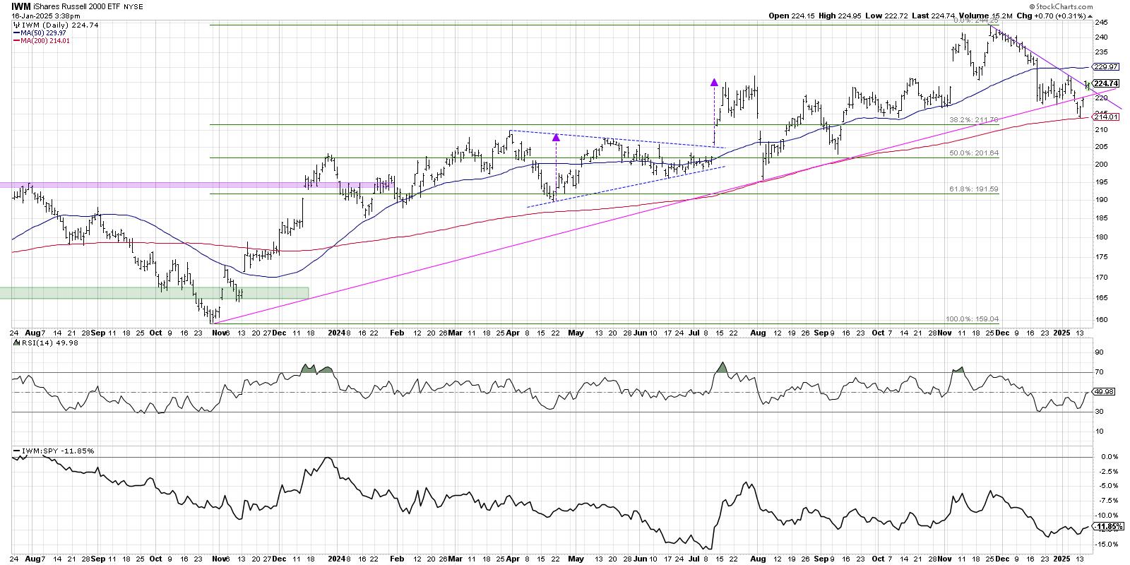 The chart of IWM itself appears to be in a neutral state, similar to what we’re observing in the other major equity indexes. A long-term trendline using the October 2023 and August 2024 lows has been violated, but this week we saw a bounce right back above this level. IWM has bounced off the 200-day moving average, as well as the 38.2% retracement of the 2024 bull market, but it still remains below its 50-day moving average.