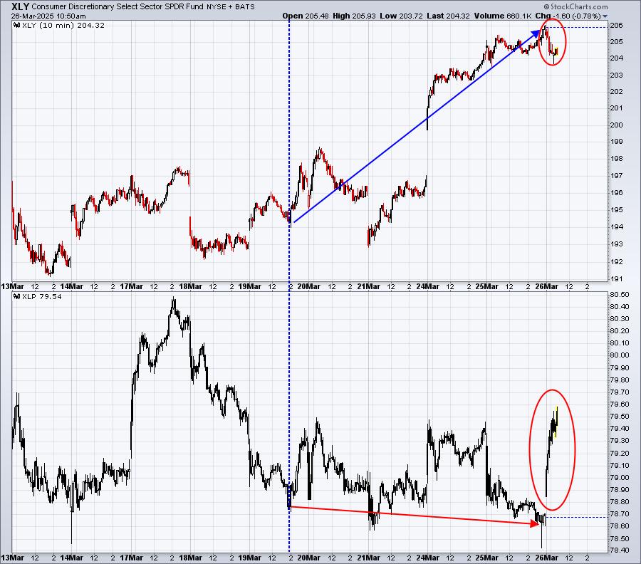 Since the Fed announcement one week ago, discretionary stocks (XLY) had reversed its downtrend vs. staples stocks (XLP). But check out today’s action! Maybe this is just short-term and we’ll see a reversal later, but it’s hard to be overly encouraged when staples goes up 1.14%, while discretionary drops 0.64%.