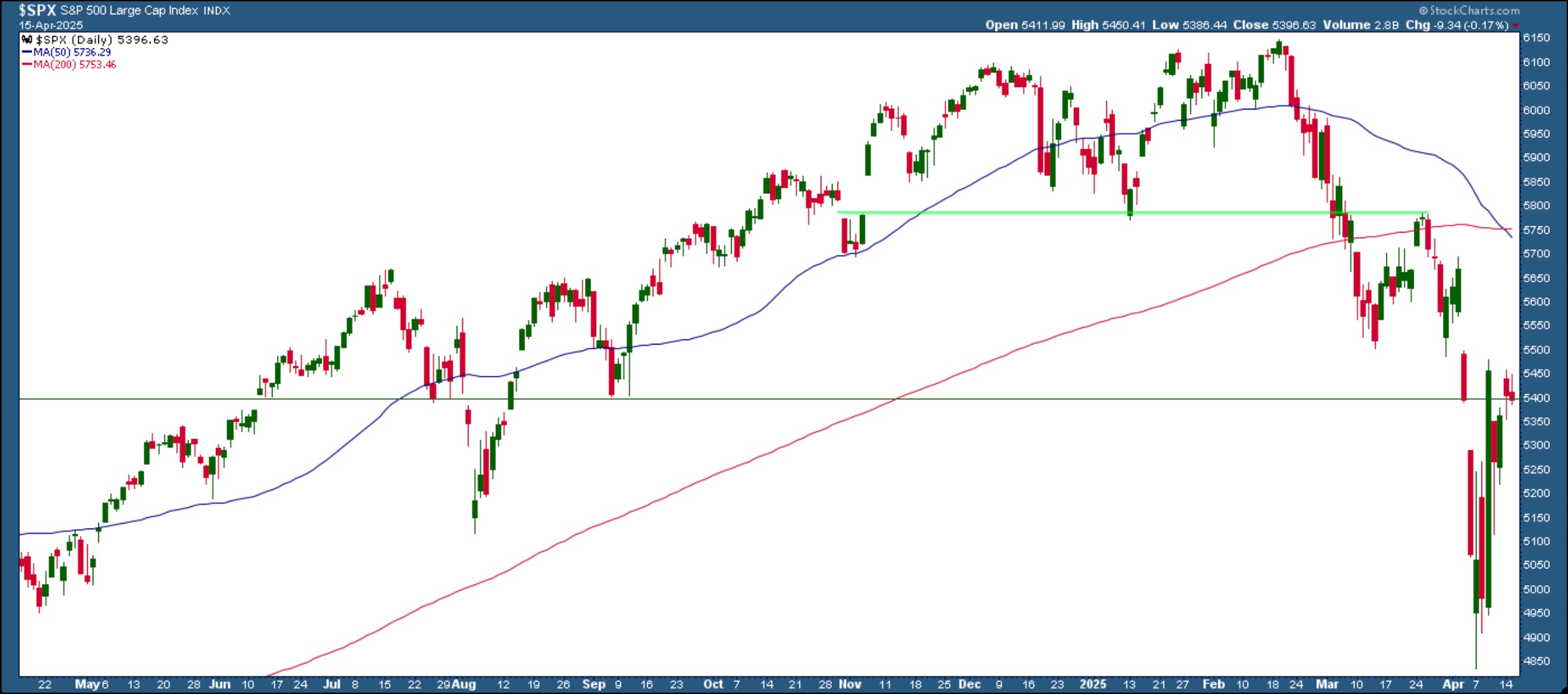 FIGURE 1. DAILY CHART OF S&P 500. After falling below its 200-day moving average, the S&P 500 is struggling to remain above at its 5400 level. Will it hold? Chart source: StockCharts.com. For educational purposes.