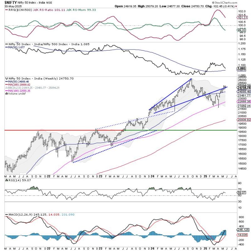 As we step into the new week, the markets find themselves in a defined trading range, more toward the edge of the pattern support on the weekly chart. The Nifty appears to continue being in a well-defined trading range between 25100 and 24500 levels. This also implies that a directional trend would emerge only if the Nifty takes out 25100 convincingly or ends up violating the 24500 level. Unless either of these two things happens, the markets will remain devoid of directional bias and will continue staying in this defined range. The present technical structure makes it even more important to maintain a steadfast focus on protecting profits at higher levels and the rotation of sectors where a likely leadership change is visible.