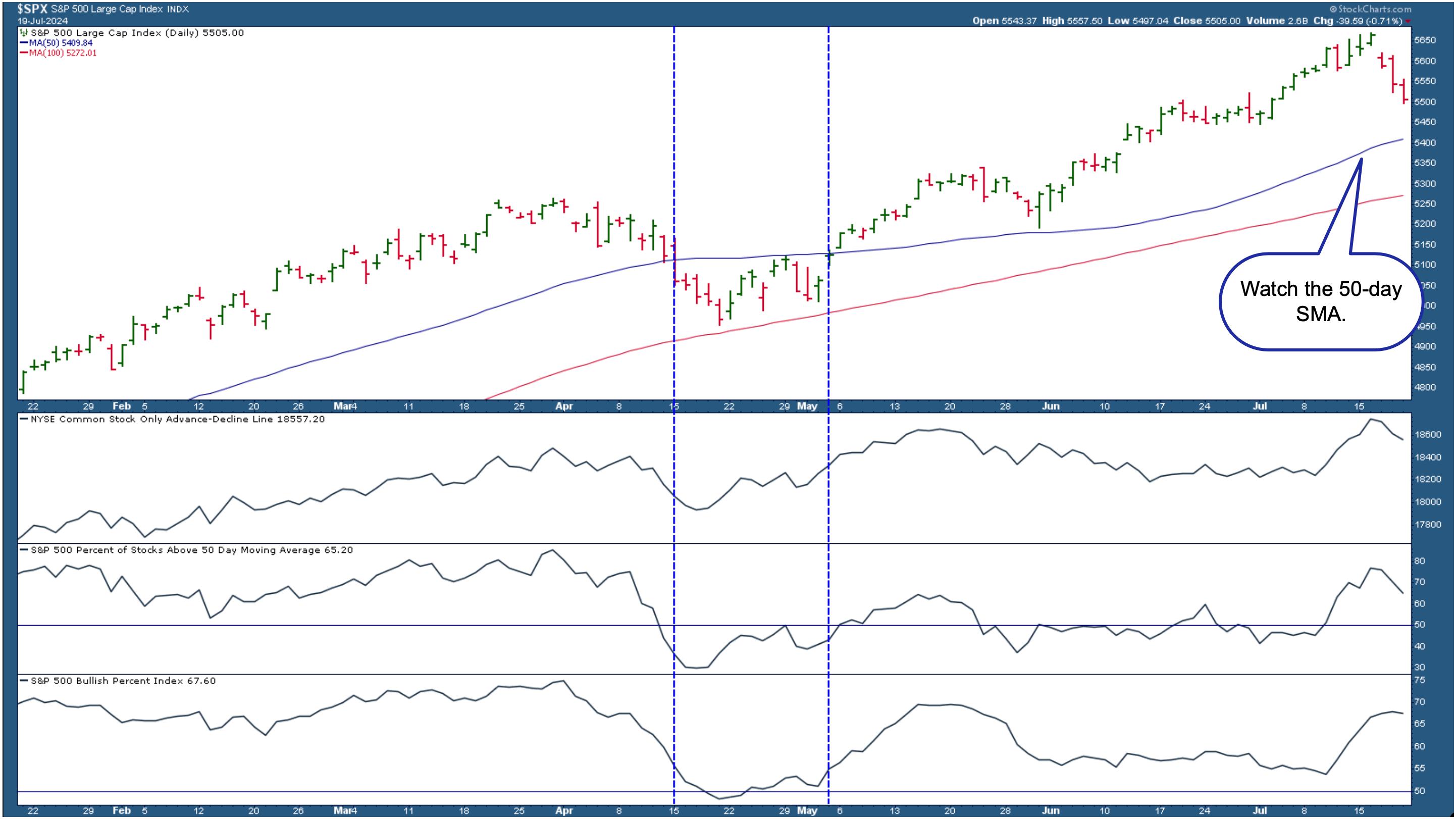 The charts presented here are an example. Feel free to apply different moving averages for your analysis. Assuming you’re looking at the chart in Chart 5, if the S&P 500 falls below the 50-day SMA, it would be time to tread carefully. Corrections are healthy and necessary and, as long as they are corrections, they could open up opportunities to load up on some stocks or exchange-traded funds (ETFs). It depends on how weak the market internals are, which is why indicators included in the chart can be helpful.