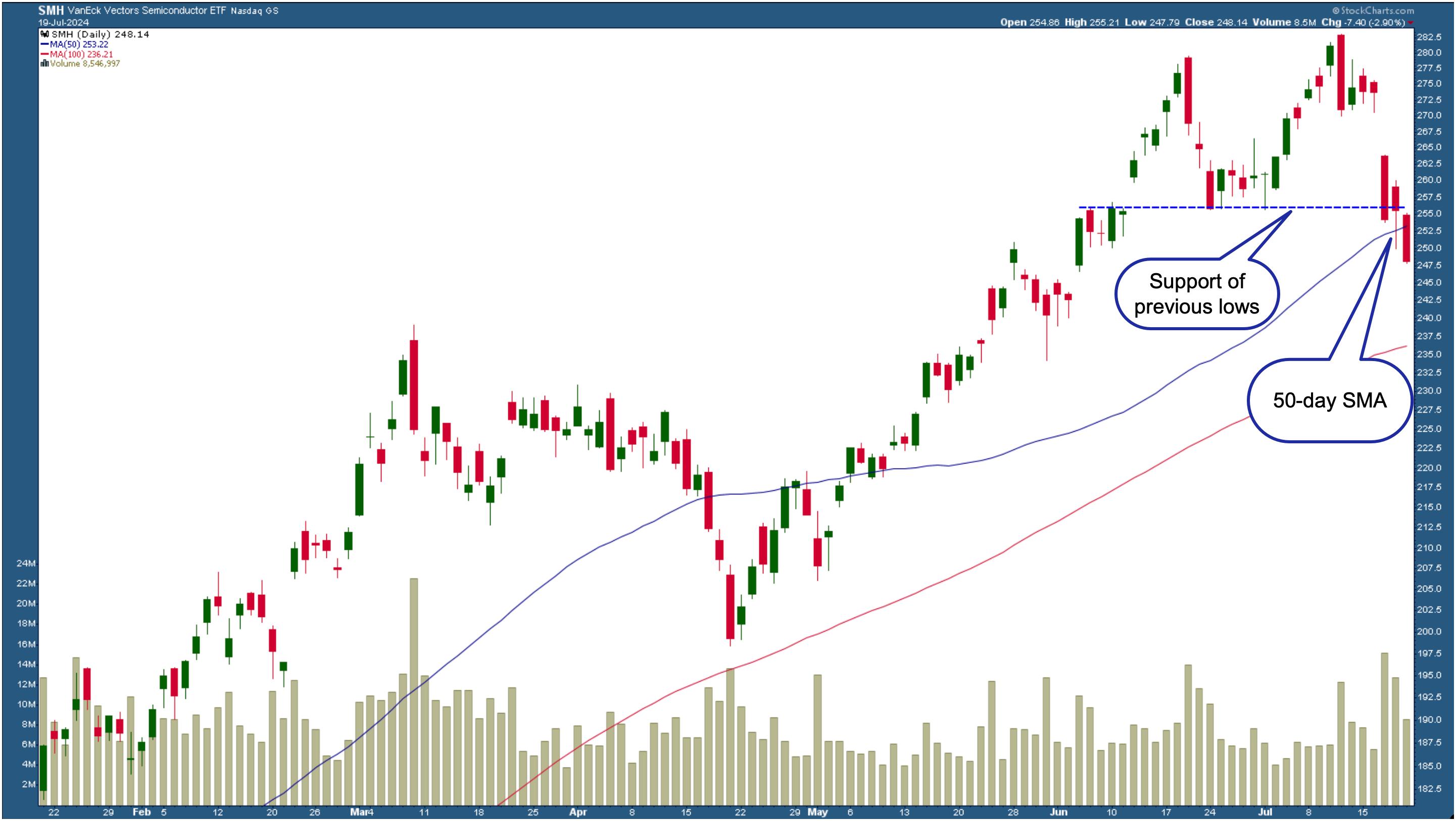 CHART 2. DAILY CHART OF THE VANECK VECTORS SEMICONDUCTOR ETF (SMH). The ETF has broken below the support of its previous lows and the 50-day SMA. The next level to watch is the 100-day SMA.Chart source: StockCharts.com. For educational purposes.