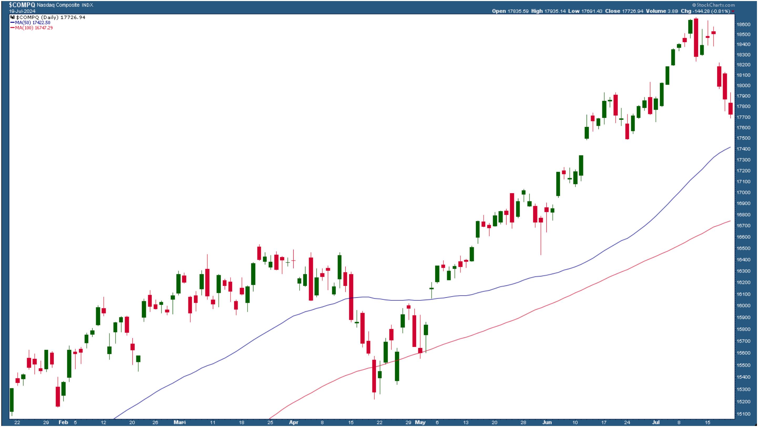 The selloff on July 11, a 1.95% drop, indicated how much the Nasdaq Composite could drop in one day. That’s to be expected when the index is as toppy as it is. On a positive note, the Nasdaq is still trading above its 50-day simple moving average (SMA).
