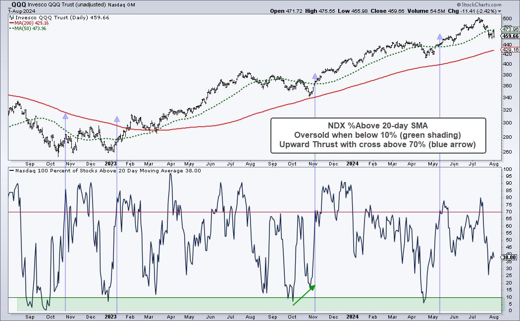 NDX %Above 20-day SMA is a breadth oscillator that becomes oversold with a move below 10% (green shading). This means more than 90% of Nasdaq 100 stocks are below their 20-day SMAs. This is an oversold extreme that can pave the way for a bounce or breakout. It is important to wait for some sort of upside catalyst because stocks can become oversold and remain oversold. The blue arrow-lines show when this indicator surges above 70% (after becoming oversold). This shows a big increase in upside participation and acts as a bullish signal.