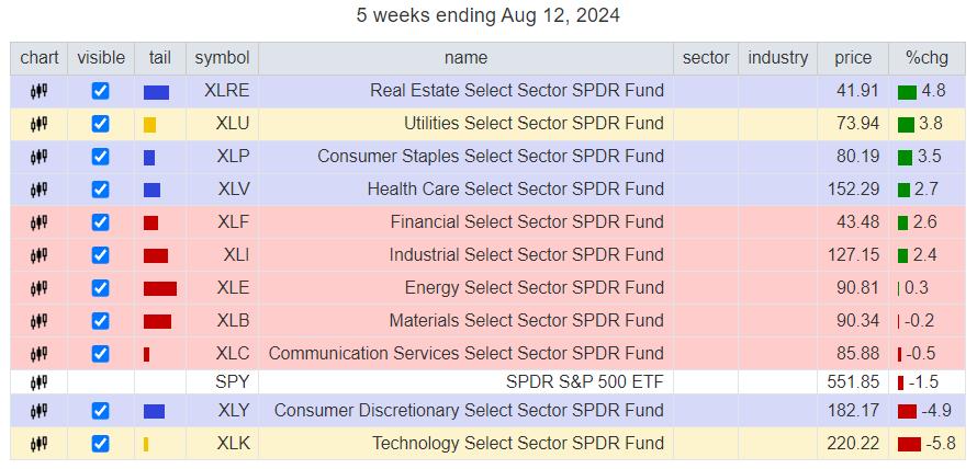 The big difference is that on this weekly RRG, Technology (and Utes) is the only sector on the right-hand, positive side of the RRG, while all others are on the left-hand, negative side of the chart.