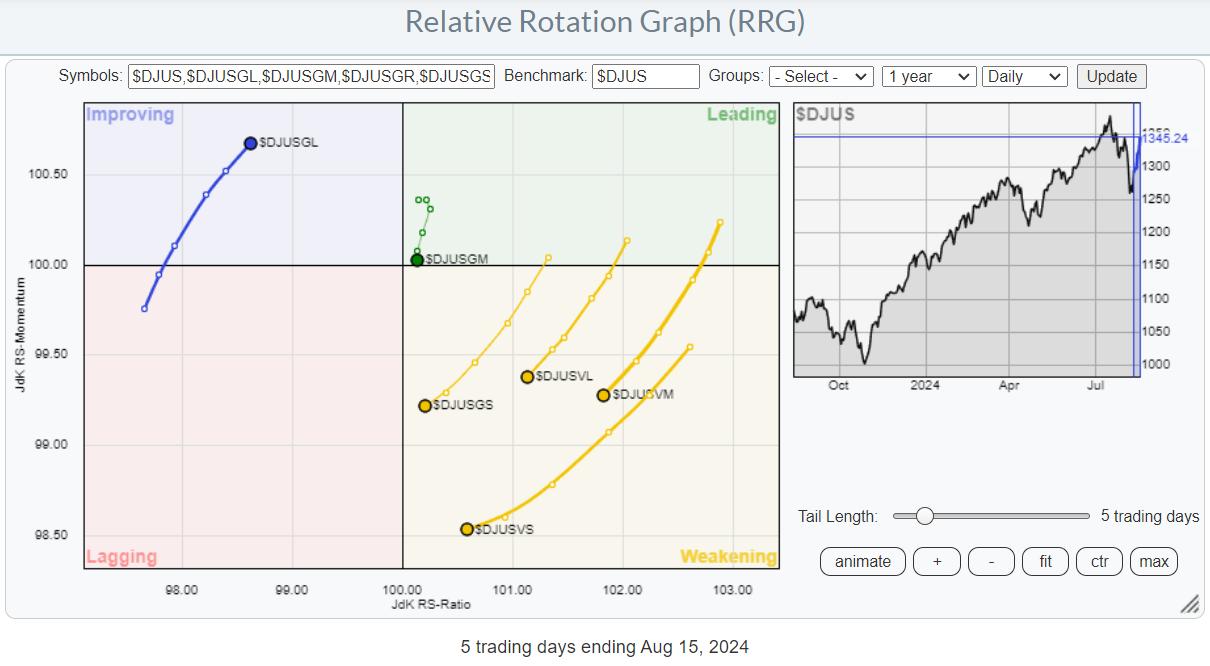 This observation also appears when we examine the weekly and daily RRGs, which show the various market segments broken down into Growth-Value and their respective size segments. Here also, the weekly RRG shows the rotation OUT of Large-Cap Growth and INTO anything else, at least on a relative basis. The Daily RRG shows the opposite: rotation INTO Large-Cap Growth and OUT of anything else.