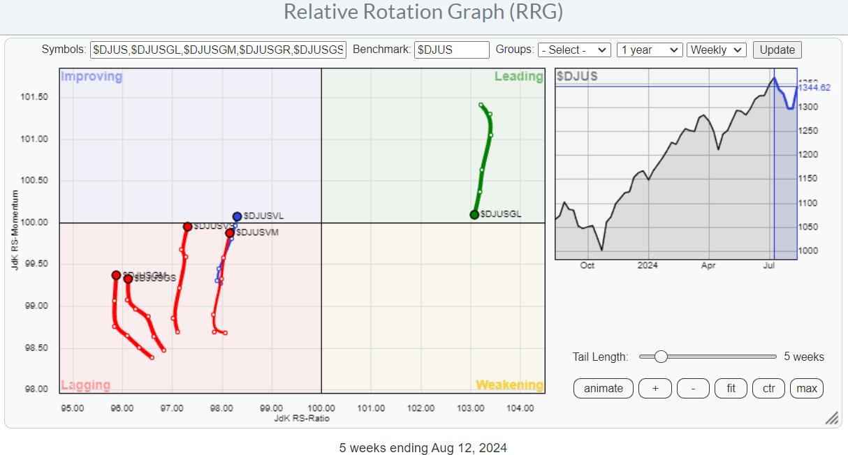 Regarding performance, discretionary and technology are the only sectors underperforming in the S&P 500. All other sectors have beaten the market over the last five weeks. Combining the info from these two RRGs leads to the belief/conclusion that the Large-Cap-Growth rotation is back, at least temporarily.