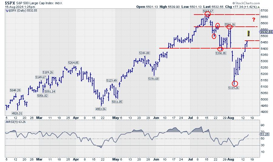 The recent rally out of the August 5th low is definitely stronger than I had anticipated. I was watching the resistance zone between 5350 and 5400, but that area was passed as if there was no supply whatsoever, at least at the index level.