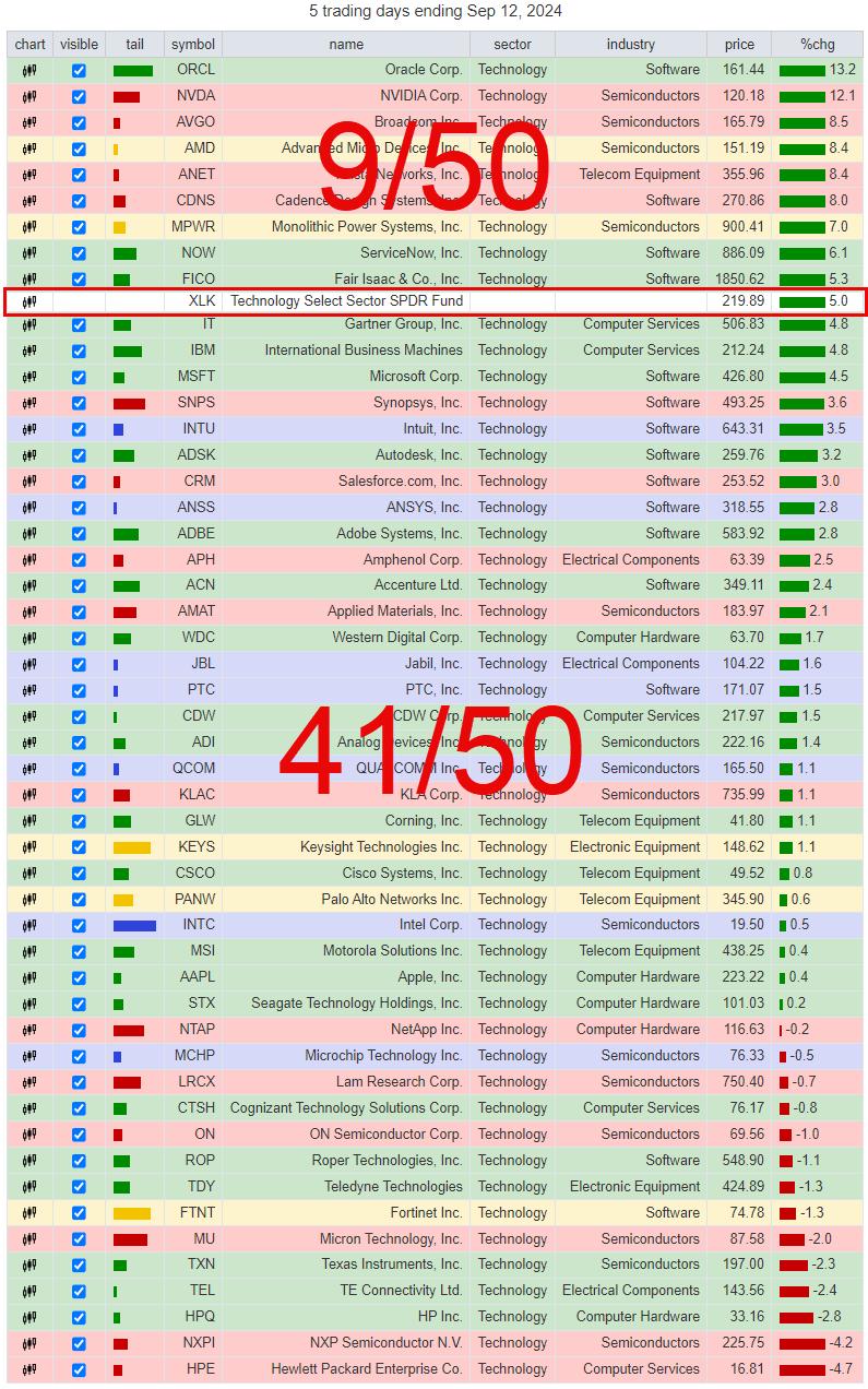 With XLK up 5% so far this week, only 9 out of the 50 stocks in this group outperform SPY. The other 41 are below XLK. With NVDA being one of the top-ranking stocks, this group is already pulling performance up by its market capitalization, especially because MSFT, the other big name inside XLK, is only 0.5% below XLK.