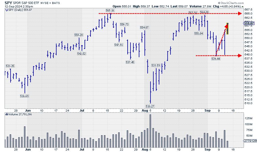After dipping to the 540 area at the end of last week, the market has recovered some of that ground so far this week. This move has now established the area around 540 as support, while overhead resistance still remains intact around 565. A break of either level will very likely ignite an acceleration in the direction of the break.