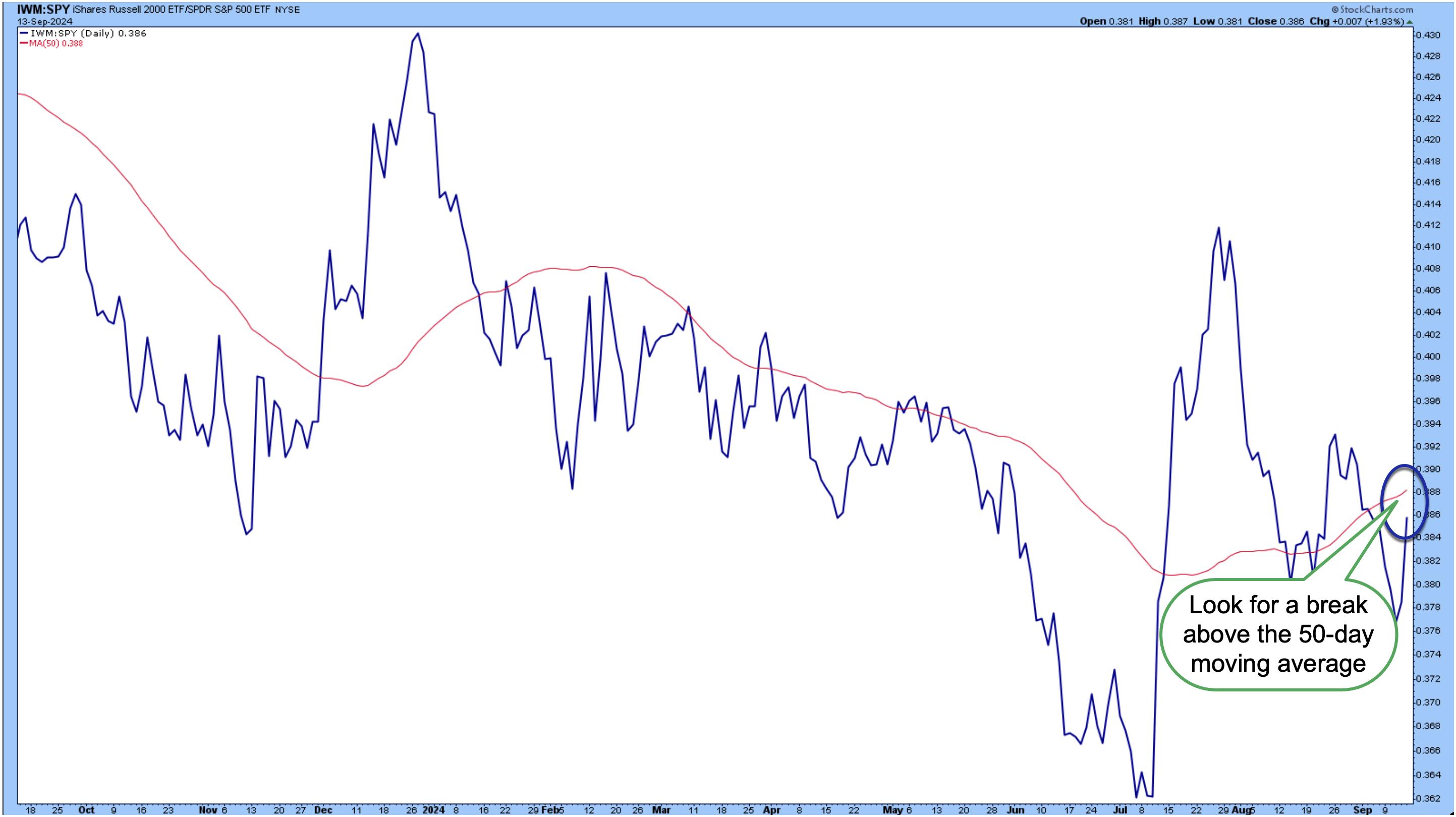 FIGURE 2. SMALL CAPS VS. LARGE CAP STOCKS. Small caps surged this week, but they still have more to go before catching up with their bigger cousins.Chart source: StockCharts.com. For educational purposes.