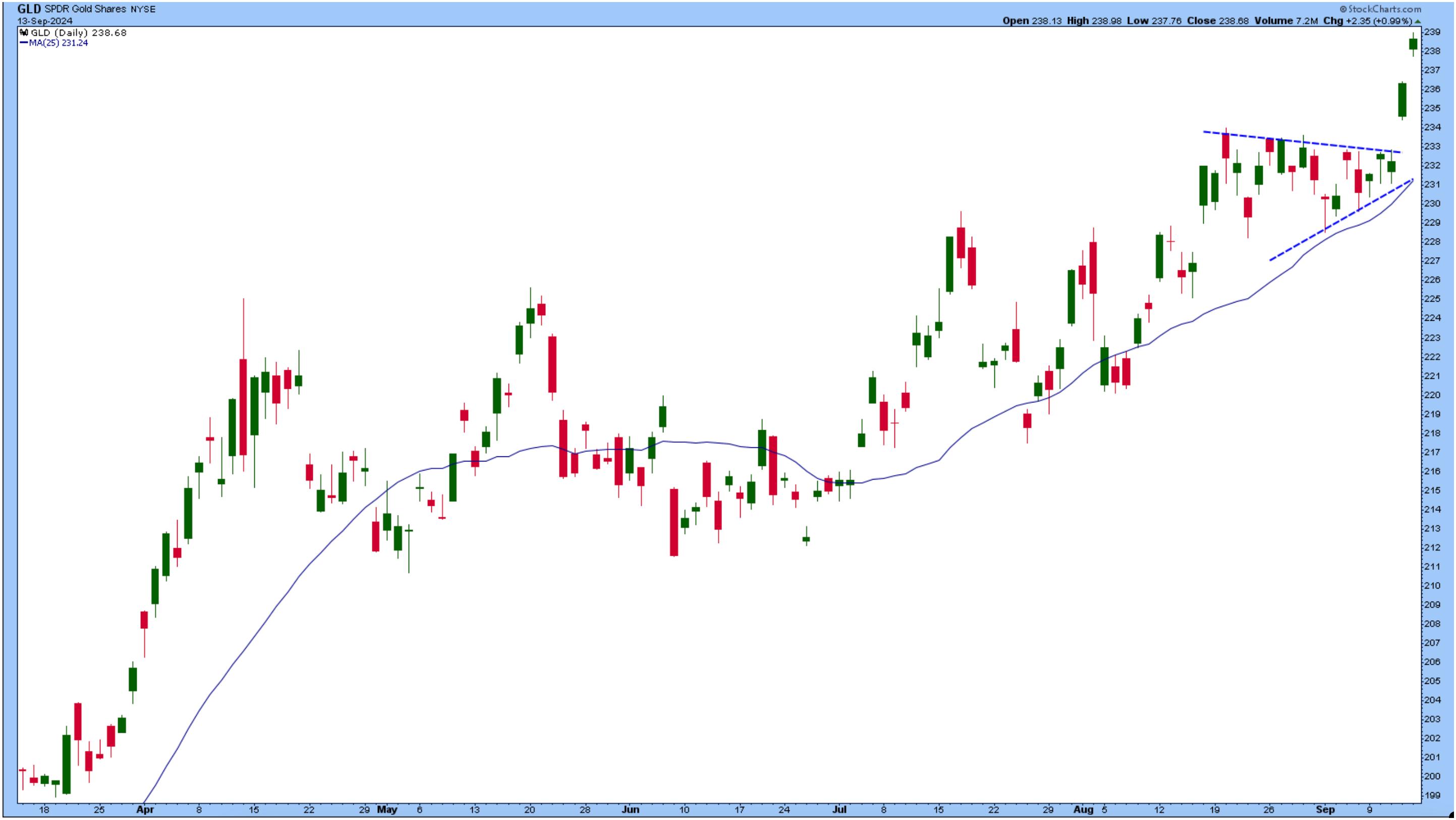 Gold prices hit an all-time high on Friday, riding on interest rate cut expectations. The daily chart of the SPDR Gold Shares (GLD) below shows price breaking above a consolidation area, gapping up, and hitting an all-time high.