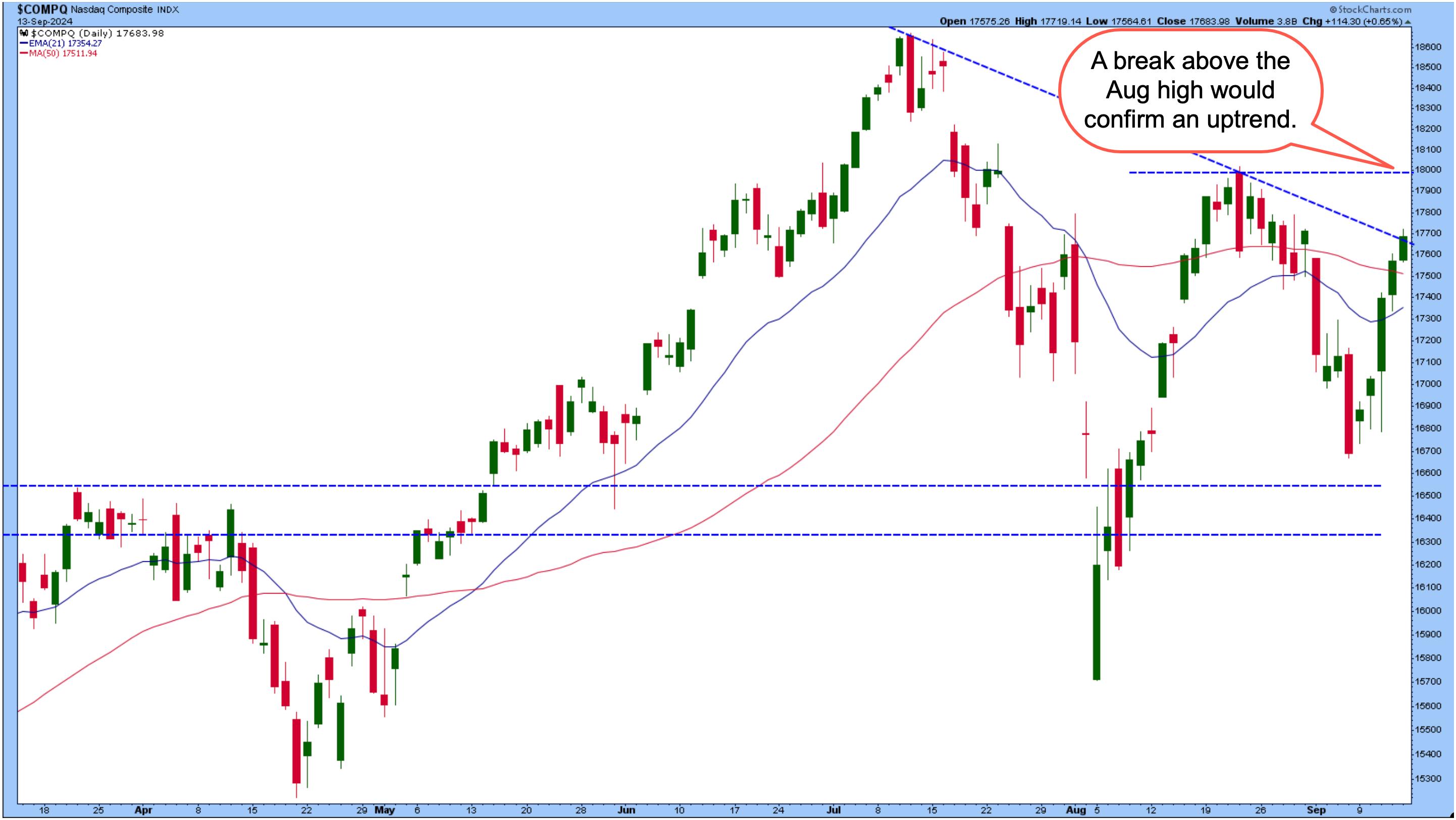 FIGURE 1. WILL THE NASDAQ COMPOSITE BREAK THROUGH ITS DOWNTREND? A break above the downtrend would be bullish for the tech-heavy index, but a more confirming move would be a break above its August high.Chart source: StockCharts.com. For educational purposes.
