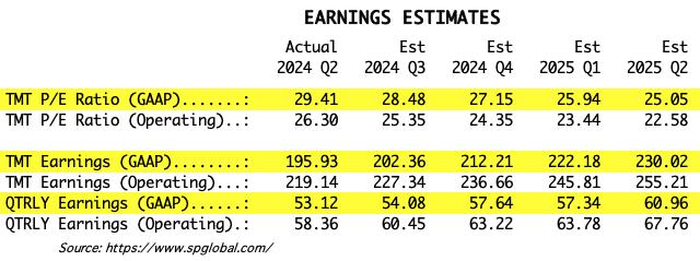 We use GAAP earnings as the basis for our analysis. The table below shows earnings projections through June 2025. Keep in mind that the P/E estimates are calculated based upon the S&P 500 close as of September 30, 2024. They will change daily depending on where the market goes from here. It is notable that the P/E is outside the normal range.