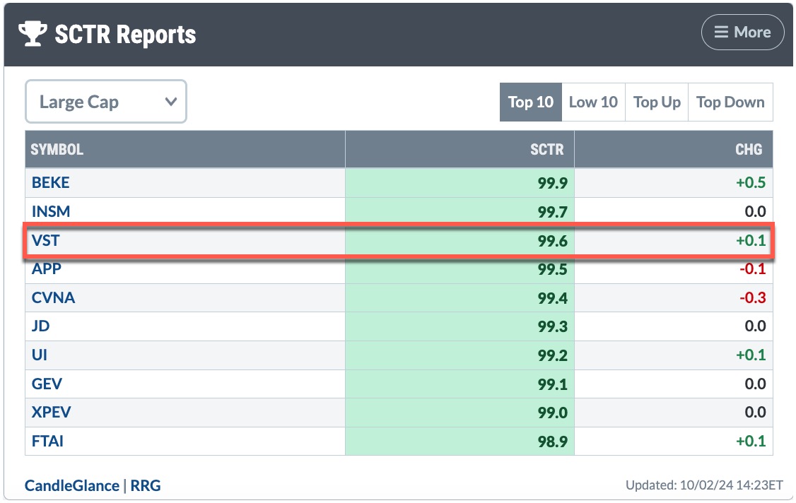 Vistra Energy Corp. (VST), which owns several nuclear plants, has seen its stock price rise 79.23% in the last six months. The stock has been in the top 5 StockCharts Technical Rank (SCTR: pronounced “scooter”) for a while and even briefly grabbed the top spot before giving up its lead.