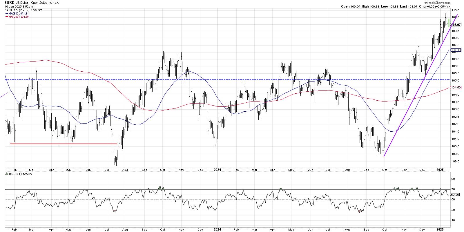While those previous two charts represent large weights in the Russell 2000, our final chart represents more of a macro tailwind for small caps. Mega cap multinational companies, such as the top weights in the S&P 500 and Nasdaq 100, generate a large percentage of their revenues outside the US. So when they go to exchange their non-US revenues back into US Dollars, the stronger $USD chart would mean those non-US revenues are much less valuable in dollar terms.