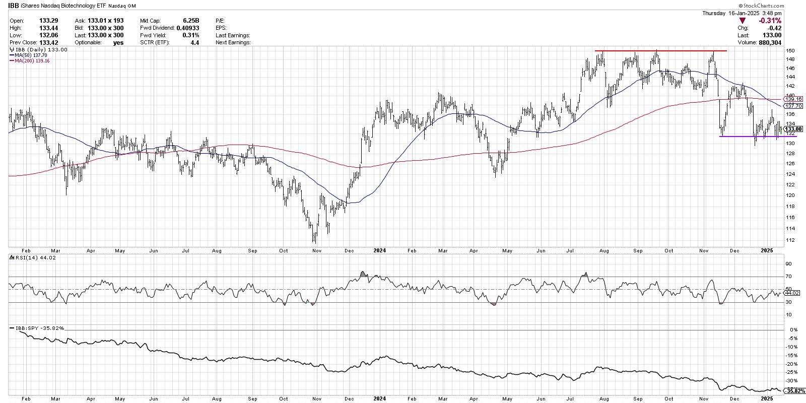 While financials have rotated higher this week, the iShares Nasdaq Biotechnology ETF (IBB) remains in a primary downtrend. However, with IBB bouncing off support around $131, this could be a setup for a bullish price rotation.
