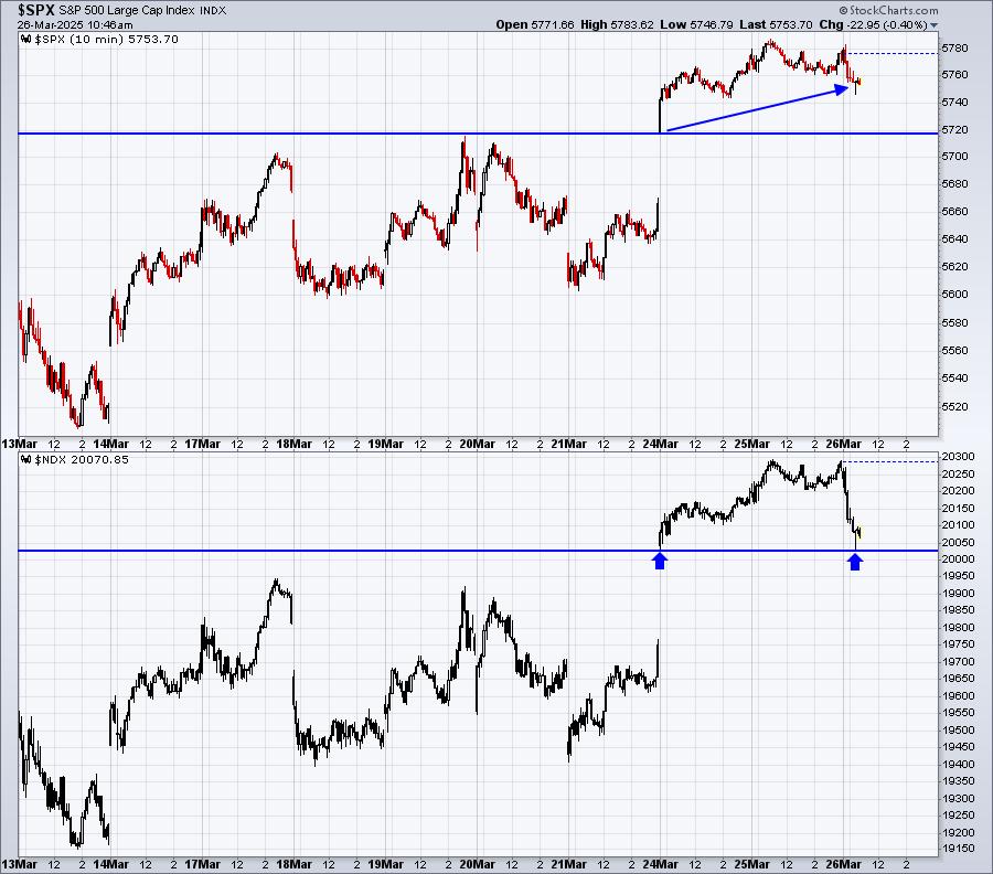 I also want to show you how the S&P 500 is performing on a short-term chart vs. the NASDAQ 100, which is the more aggressive index: