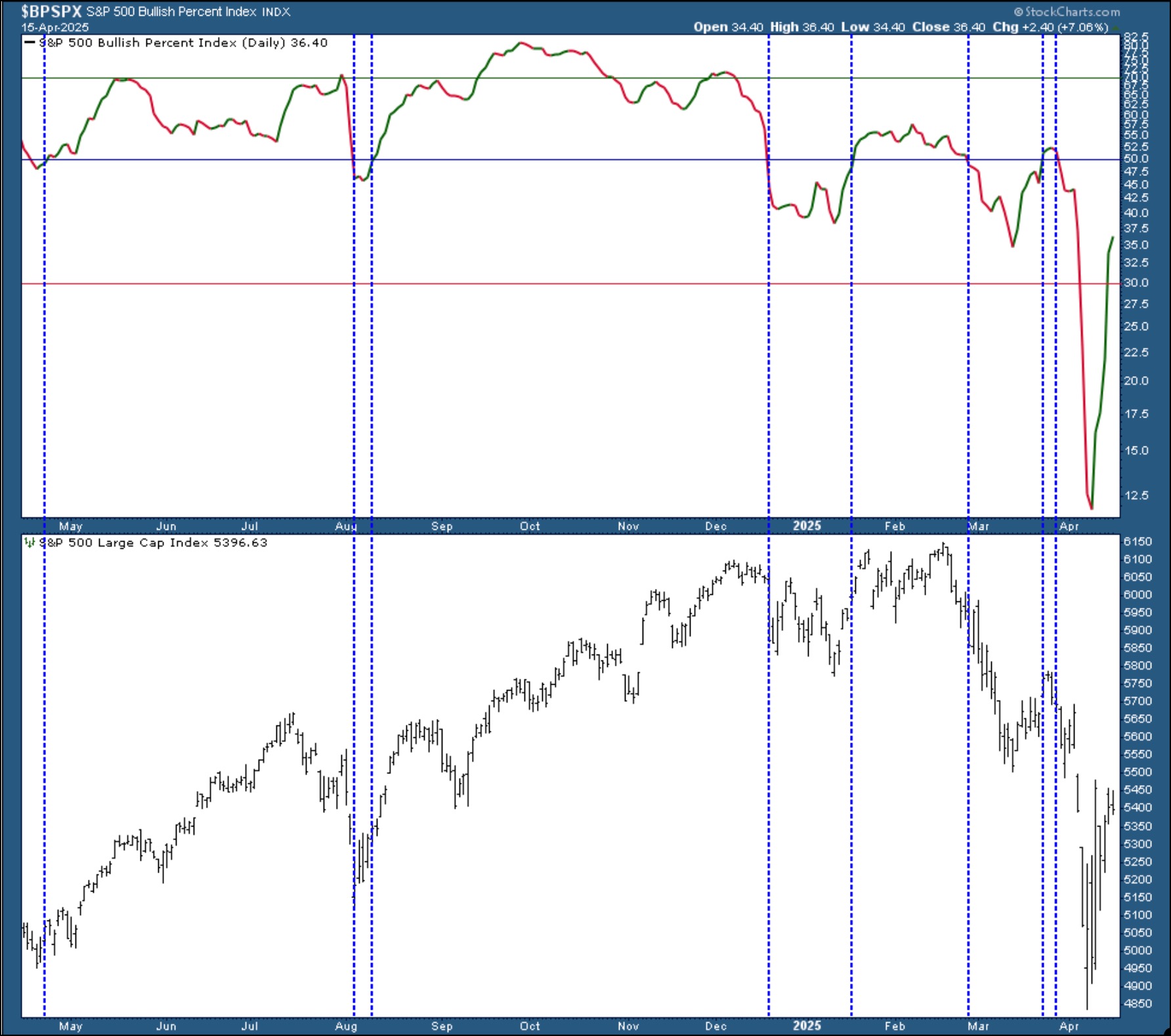 The recent slide in the S&P 500 took the $BPSPX to well below 12.5. It has reversed and is above 30, which is encouraging. A rise above 50 is bullish but, as you can see in the chart, the last time $BPSPX crossed above 50 (dashed blue vertical lines), it turned back lower, only to start its descent to the lowest level in the past year. Save your excitement until the $BPSPX is over 50 and a turnaround in the $SPX is in place.
